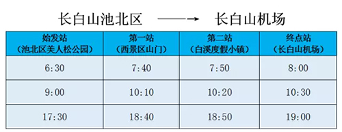 由【池北區(qū)美人松園(金水鶴酒店前)】始發(fā),途徑【長白山西景區(qū)山門】、【白溪度假小鎮(zhèn)】,終到【長白山機場】。車票實行一票制,價格40元/位/次。
